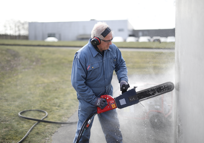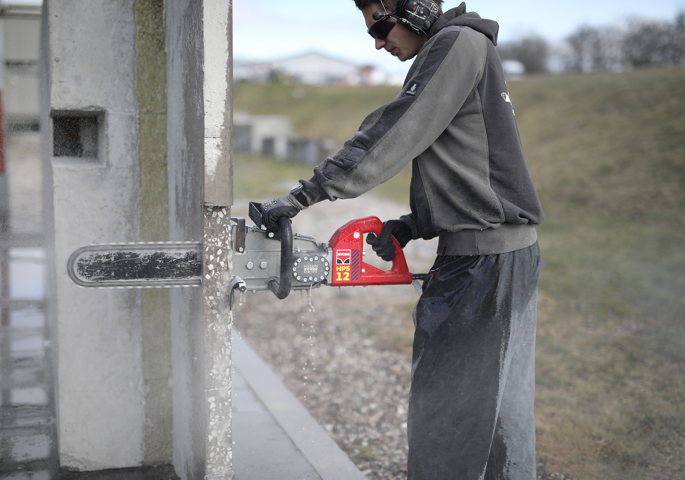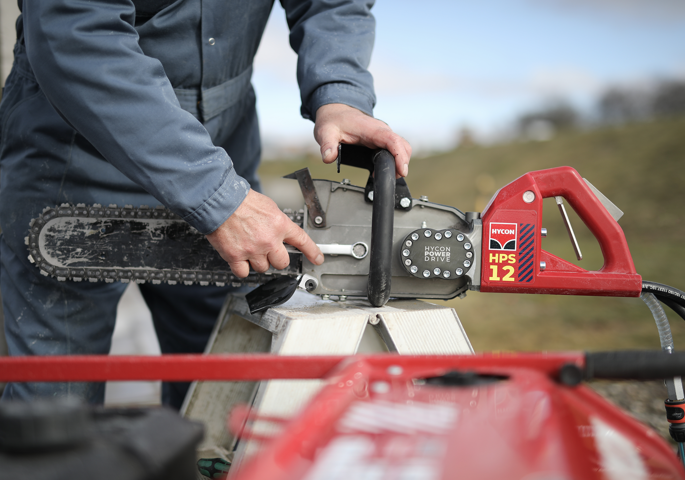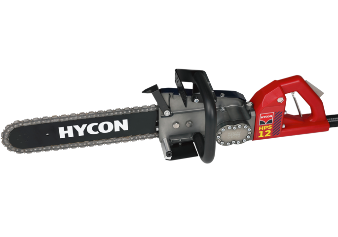 La sierra de cadena HYCON HPS12 corta todo tipo de hormigón, acero, roca, etc. Con un caudal de aceite de 46 LPM, está diseñada para cortes de hormigón de alta exigencia y cuenta con corte al ras de serie.